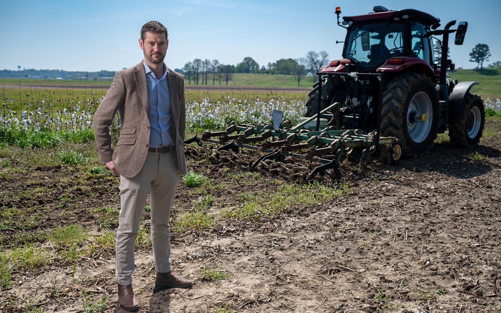 Kit Franklin, a visiting scholar at Mississippi State University's Agricultural Autonomy Institute, poses at the institute's North Farm proving ground. (Photo by Kevin Hudson)